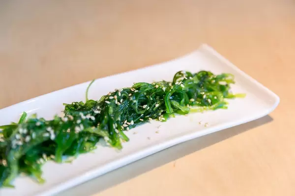 Nahaufnahme des veganen Algensalats "Goma Wakame" mit Sesamkernen bestreut, auf einem weißen länglichen Teller