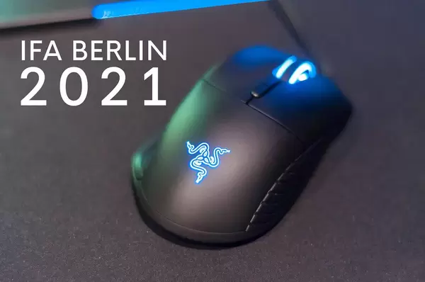 Gaming Mouse by Razer with blue light and next to the title "IFA Berlin 2021"