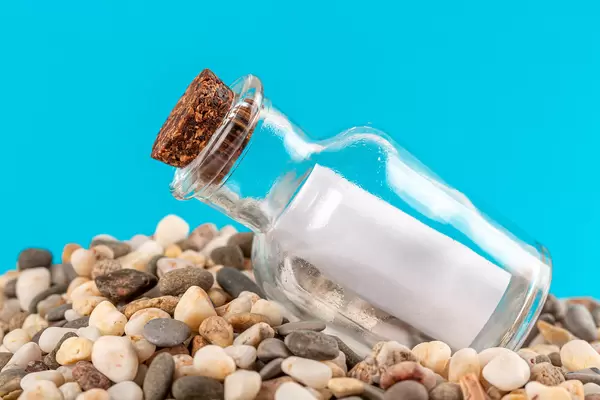 Message in a glass bottle on a blue background with stones and a starfish