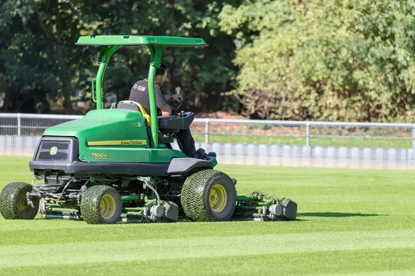 Rasenmähen mit schwerem Gerät: John Deere 7500A am Fußballplatz