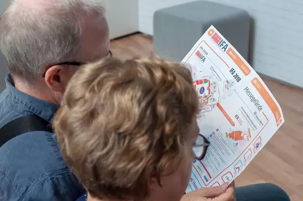 Besucher schauen sich den Hallenplan der IFA 2018 an