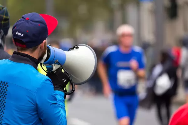 Man with a bullhorn cheering the runners on - Frankfurt Marathon 2017