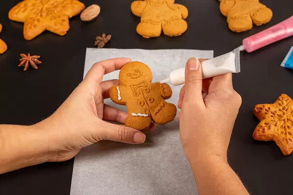 Hands decorate christmas gingerbread with glaze