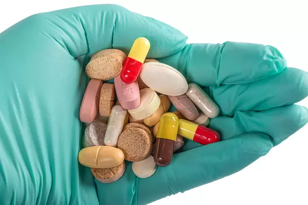 Hand with a glove with tablets and capsules of different colors