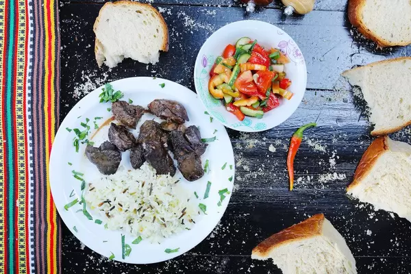 Duck liver with wild rice on a white plate. Fresh vegetables salad and white bread. (Flip 2019)