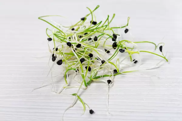 Kleine Zwiebelsprossen in einer offenen Plastikschale auf einem weißen Holztisch