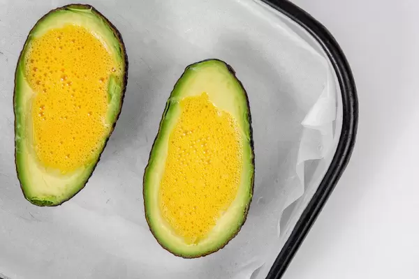 Top view of sliced Avocado with eggs ready for baking (Flip 2019)