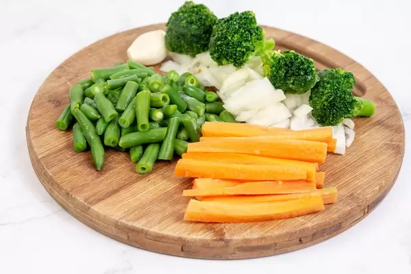 Sliced Carrot with Green Beans Onions and Broccoli on the wooden board