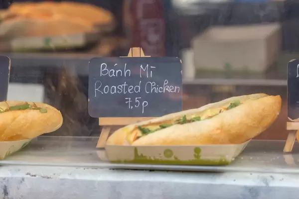 Vietnamesischer Stand bietet Bánh Mí Sandwich mit gebratenem Hünchen und Gemüse auf kompostbarem Papierteller auf dem Tomorrowland Festival