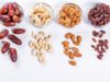 Obere Aufnahme von getrockneten Datteln, Cashewnüsse, Mandeln und Rosinen in kleinen GlasschalenDas Bild Obere Aufnahme von getrockneten Datteln, Cashewnüsse, Mandeln…