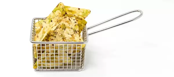 Close-up of vegan snack "vaya bean salt snack"-Chips by Zweifel, in a frying basket