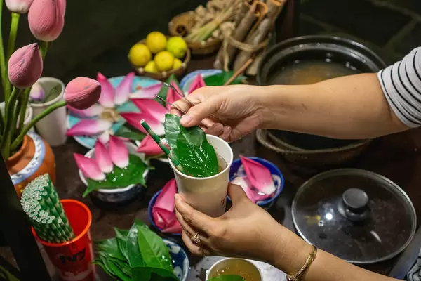 Woman preparing Traditional Herbal Tea with Lotus Flowers, Leaves, Lime and Lemongrass in a Paper Cup with Paper Straw in Hoi An, Vietnam