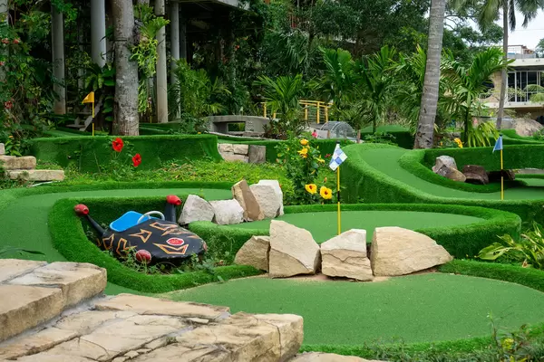 Verschiedene Minigolf Bahnen mit vielen Pflanzen und anderen Dekorationen bei Rory's Beach Club auf der Insel Phu Quoc, Vietnam