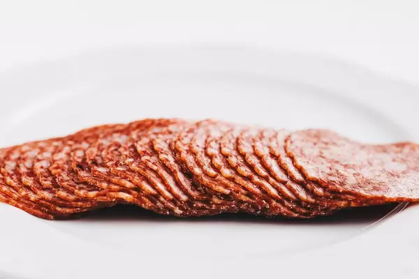 Nahaufnahme von Schinkenscheiben in weißem Teller. Weißer Hintergrund