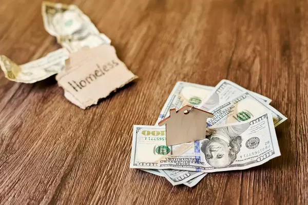 Close-up shot of wooden house toy on a stack of US dollars and homeless note at the background