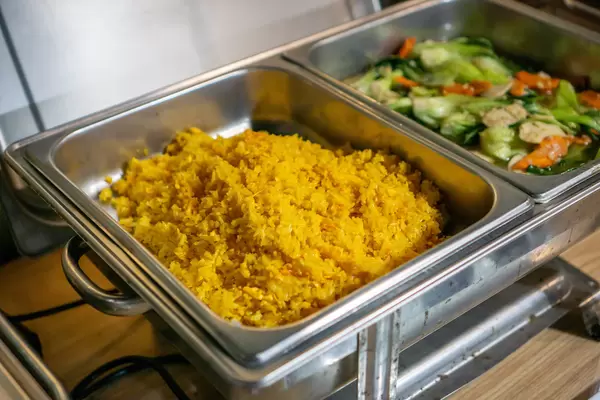 Asian Fried Rice and Stir Fried Vegetables in a Food Warmer at a Buffet inside a Restaurant