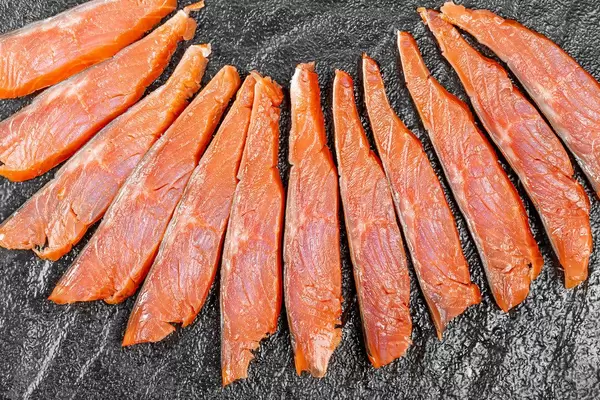 Sliced fillet of smoked red fish on a black background (Flip 2020)