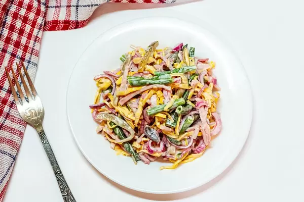 Salad with asparagus, sliced ham and scrambled eggs, pickled purple onion and cucumbers and sauce