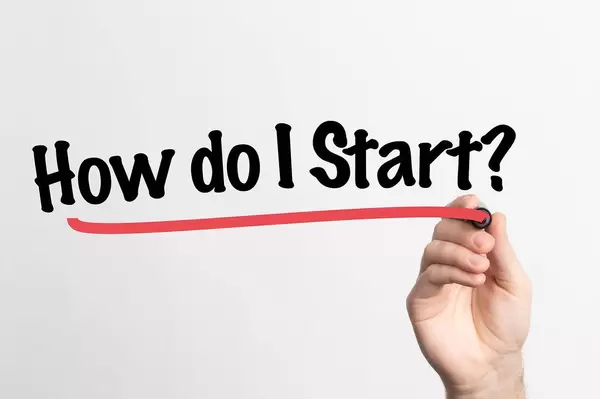 Hand schreibt die Frage "Wie beginne ich? / Wie fange ich an?" auf ein Whiteboard
