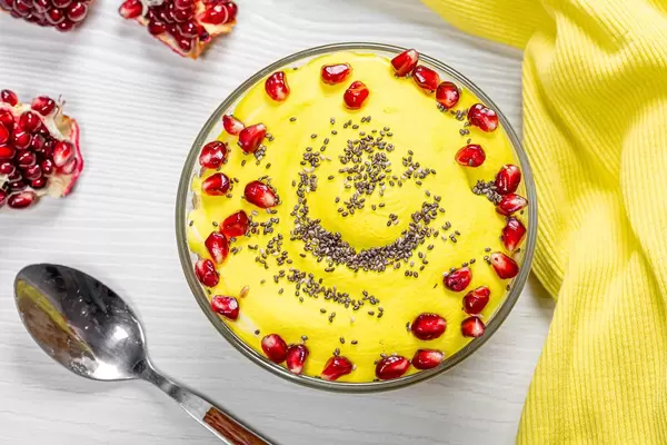 Top view Oatmeal with pomegranate and Chia seeds with spoon and yellow kitchen towel on white wooden table (Flip 2019)