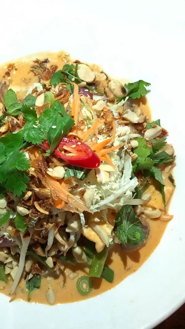 Chum Chay - veganes Bio-tofu in rotem Kokoscurry mit Buschbohnen, Möhren, Maronen, Zwiebeln, Champignons, Shiitake-pilzen auf Duftreis, dazu frische Sojakeime, exotische Kräuter, Erdnüssen und Röstzwiebeln