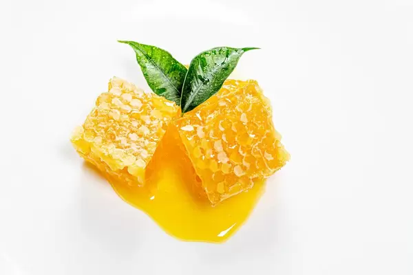 Bienen-Honigwabe und Honig auf einem weißen Teller