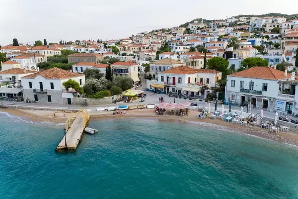Luftbild zeigt Schiffe vor der griechischen Insel Spetses und griechische Kalksteinhäuser am Kaiki Strandweg