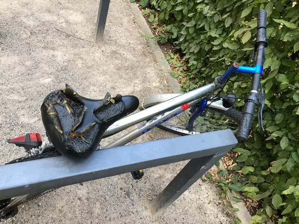 Vandalismus in der Großstadt: Zerstörter Fahrradsattel mit zerrissenen Gelpolstern