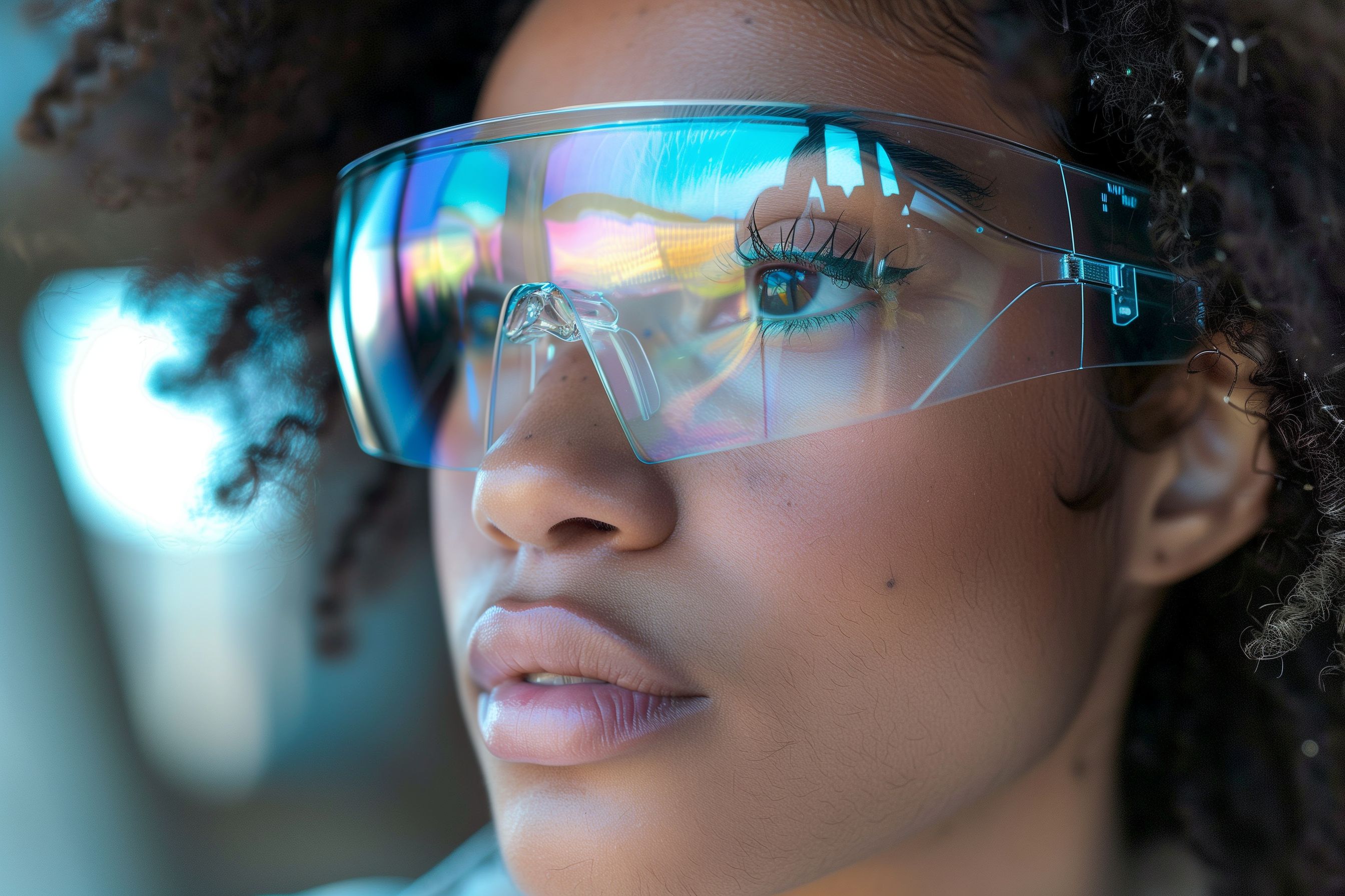 Dieses faszinierende Foto zeigt das Gesicht einer jungen Frau, die eine moderne, futuristische Augmented-Reality-Brille trägt. Die Brille reflektiert bunte, psychedelische Muster, die sich über ihr Gesicht legen und einen beeindruckenden, digitalen Effekt erzeugen. Mit ihrem ernsten Gesichtsausdruck und der technologischen Ausrüstung vermittelt die Frau ein Bild von Konzentration und Zukunftsvisionen.