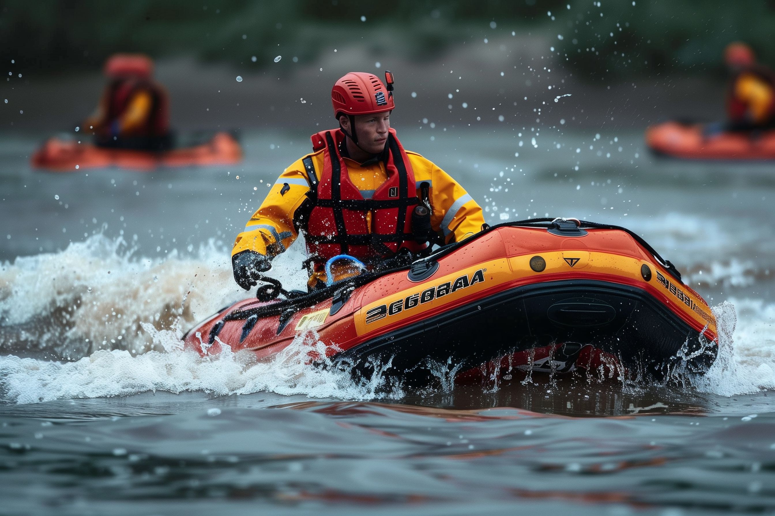 Dieses Foto zeigt einen Rettungsschwimmer in Aktion, der mit einem orangefarbenen Rettungsboot durch eine stürmische See fährt. Der Retter trägt einen gelben Neoprenanzug und einen roten Helm, um sich vor den widrigen Wetterbedingungen zu schützen. Der Spritzwasser und die aufgewühlten Wellen um das Boot herum lassen erahnen, dass es sich um einen schwierigen Einsatz handelt. Dieses kraftvolle Bild vermittelt Dramatik und Adrenalin und wäre ideal als kostenloses Stockfoto für Blogs, Newsletter oder Social-Media-Posts zu Themen wie Naturkatastrophen, Sicherheit, Rettungseinsätze oder Outdoor-Aktivitäten geeignet. Das Foto ist in hoher Auflösung verfügbar und kann unter den Bedingungen der Creative Commons-Lizenz verwendet werden.