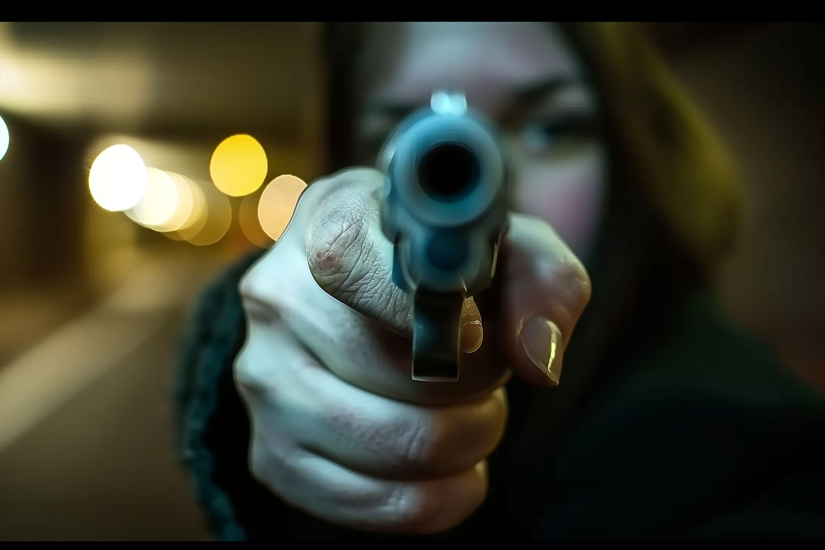 Das Bild zeigt eine Nahaufnahme einer Handwaffe vor einem unscharfen, beleuchteten Hintergrund. Der Fokus liegt auf der Mündung der Pistole, die von einer Hand gehalten wird. Die Beleuchtung im Hintergrund erzeugt einen Bokeh-Effekt, der dem Bild eine spannungsgeladene Atmosphäre verleiht. Das Foto könnte in Kontexten wie Nachrichten, Krimiserien oder Thrillerfilmen eingesetzt werden, um Dramatik und Bedrohung zu vermitteln. Als kostenloses Stockfoto in hoher Auflösung und unter Creative-Commons-Lizenz ist es vielseitig einsetzbar, z.B. für Blogs, Newsletter oder Social-Media-Beiträge.