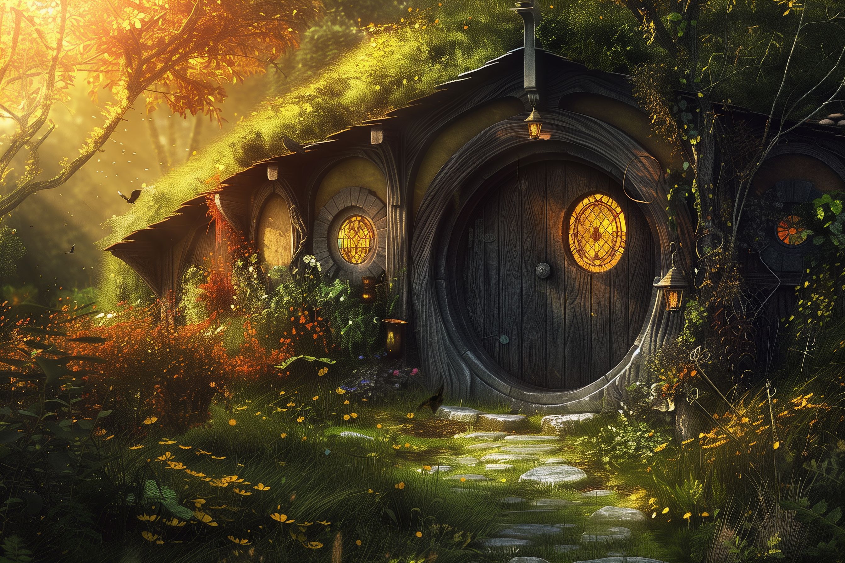 Dieses faszinierende Foto zeigt ein malerisches Hobbithaus, eingebettet in einen üppigen, grünen Märchenwald. Der Blick fällt auf die rustikale Holztür mit ihren kunstvollen Bögen und den runden Fenstern, die warm von innen erleuchtet sind. Der Pfad, der zum Eingang führt, ist von Moos, Blumen und Laub bedeckt, verleiht der Szene eine zauberhaft-geheimnisvolle Atmosphäre. Die goldenen Sonnenstrahlen, die durch die Baumkronen brechen, tauchen das ganze Bild in ein warmes, stimmungsvolles Licht. Dieses Foto weckt Assoziationen zu Fantasy-Welten und Abenteuern und lässt den Betrachter in eine fantasievolle Welt eintauchen. Es eignet sich hervorragend als kostenloses Stockfoto für kreative Projekte in hoher Auflösung und unter der Creative Commons-Lizenz.