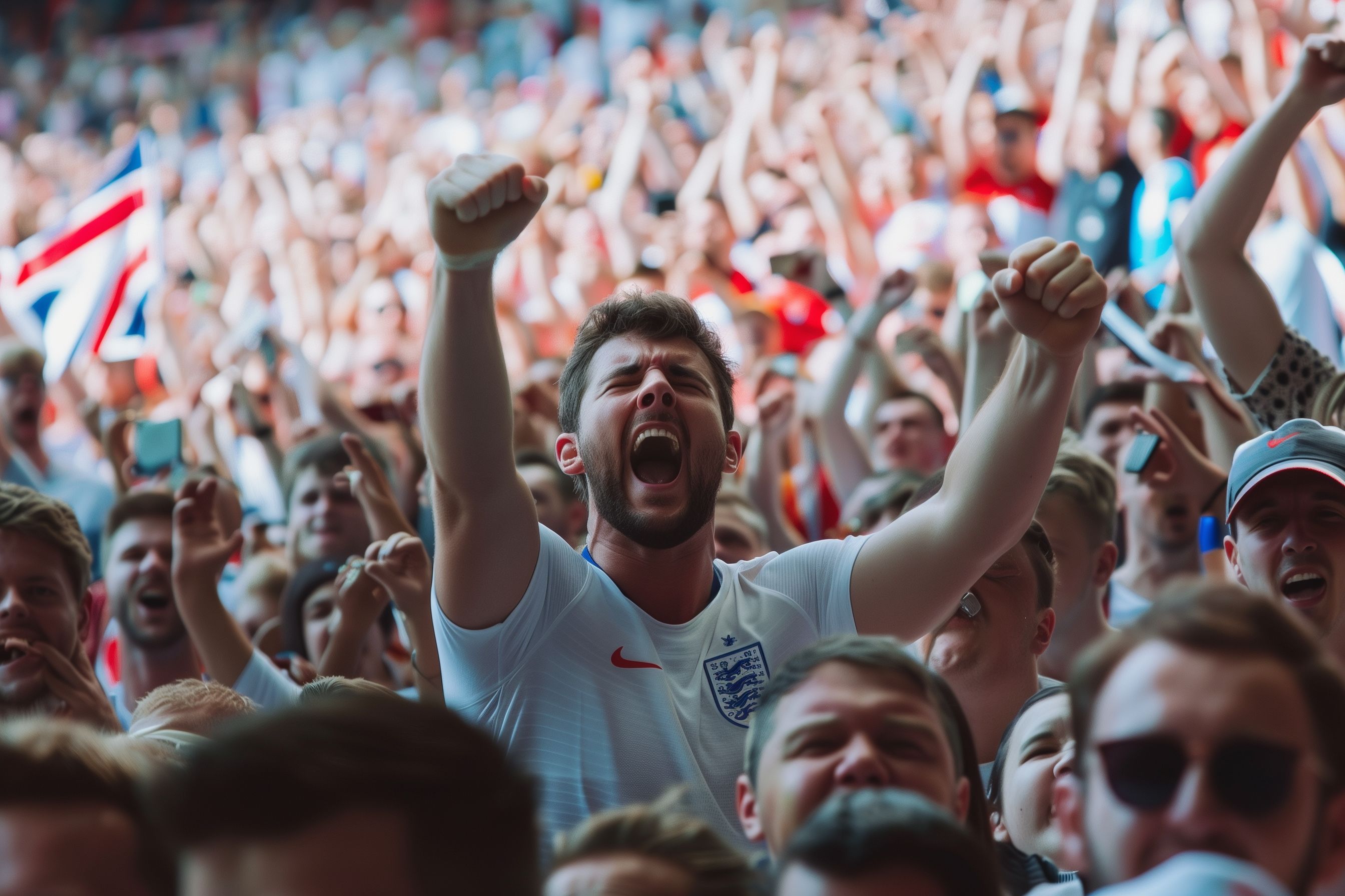 Das Foto zeigt eine begeisterte Menge an Fußballfans, die mit erhobenen Armen jubeln. In der dichten Menschenansammlung ist eine euphorische Stimmung zu spüren, wie sie bei Großveranstaltungen und Sportevents häufig zu beobachten ist. Das Bild vermittelt eine lebendige, energiegeladene Atmosphäre und die Freude der Fans an ihrem Team. Als kostenloses Stockfoto in hoher Auflösung ist das Bild ideal für die Verwendung in Blogs, Newslettern, Werbematerialien oder sozialen Medien, wo es eine emotionale und dynamische Stimmung erzeugen kann.