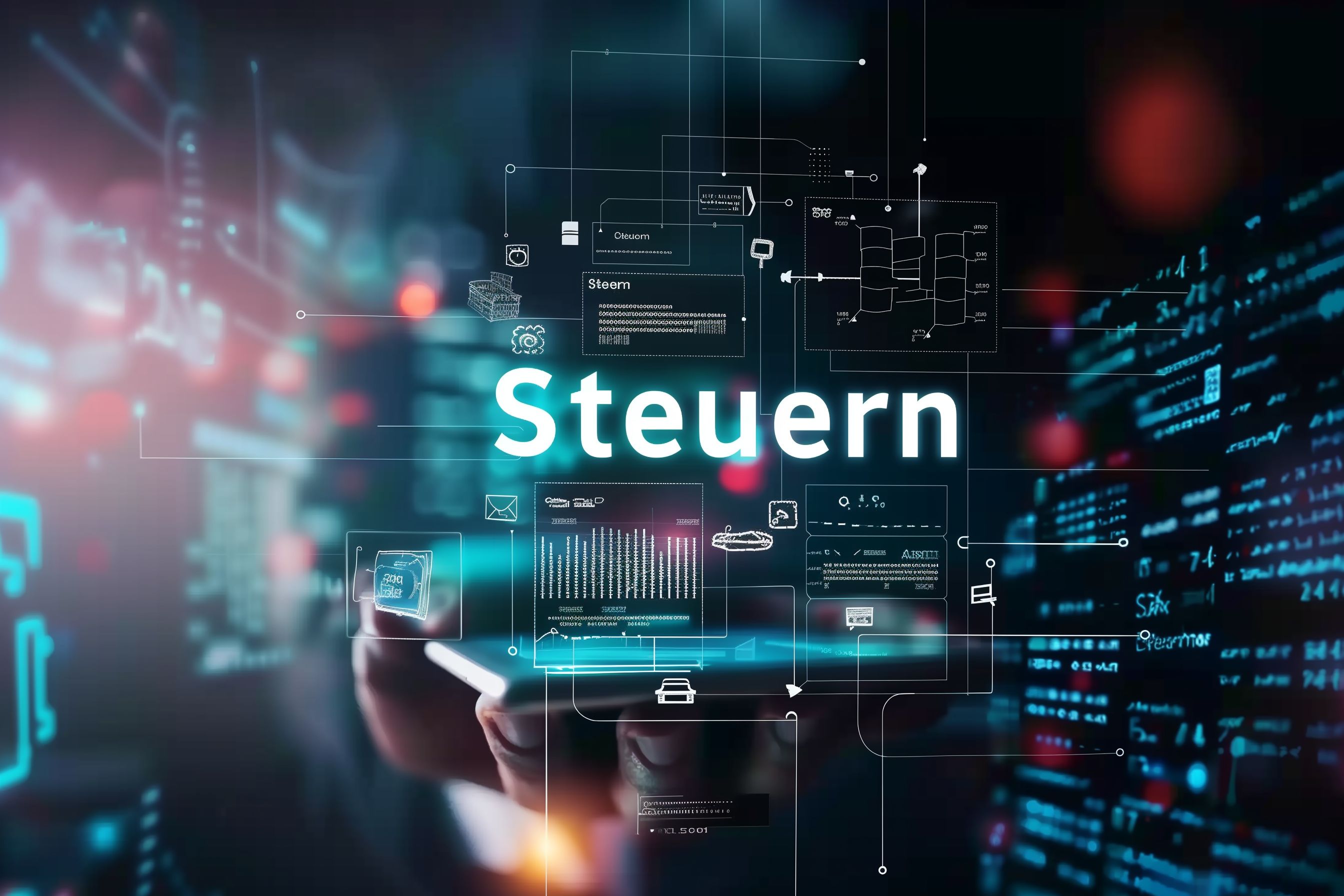Dieses Foto zeigt ein futuristisches Datentransport-Konzept mit dem Wort 'Steuern' im Mittelpunkt. Der Hintergrund ist dunkel und verschwommen, was den technologischen und digitalen Charakter des Bildes unterstreicht. Verschiedene grafische Elemente wie Diagramme, Netzwerksymbole und Datentransferlinien verleihen dem Bild einen komplexen, digitalen Charakter.