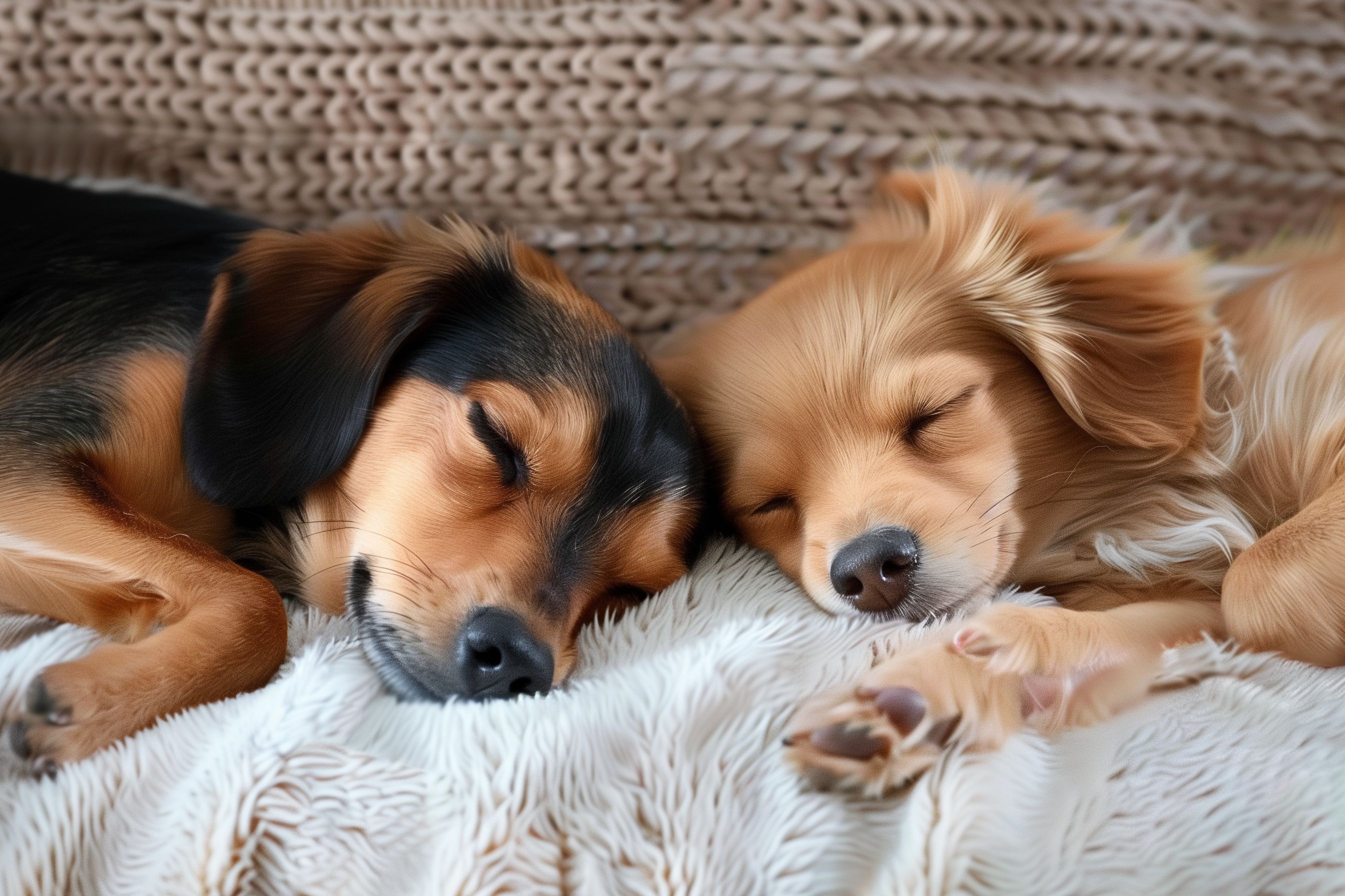 Das Bild zeigt zwei Hunde, die friedlich auf einer flauschigen, beigen Decke schlafen. Die beiden Vierbeiner - ein braunschwarzer und ein golden-brauner - haben es sich in der gemütlichen Umgebung bequem gemacht und genießen ihren Tiefschlaf. Das Foto strahlt eine ruhige, wohlige Atmosphäre aus und vermittelt Entspannung.
