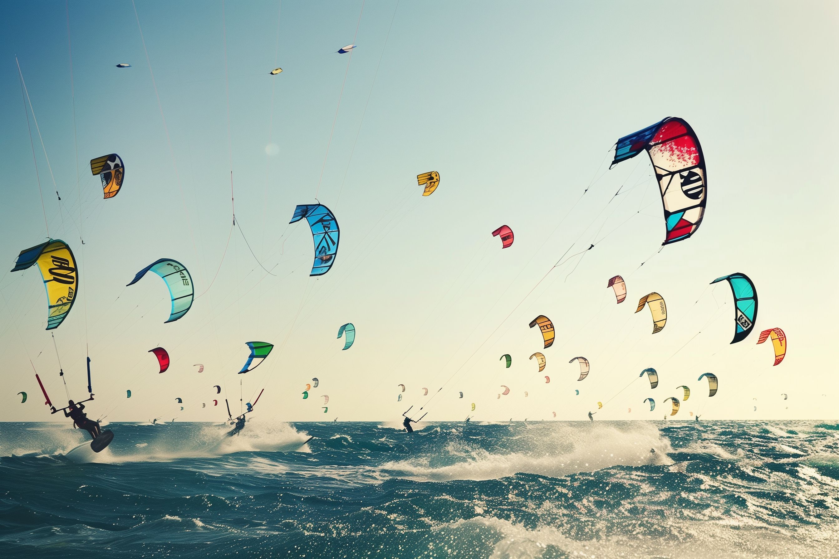 Kitesurfer inmitten farbenfroher Drachen auf Wellen von Marco Verch unter Creative Commons 2.0