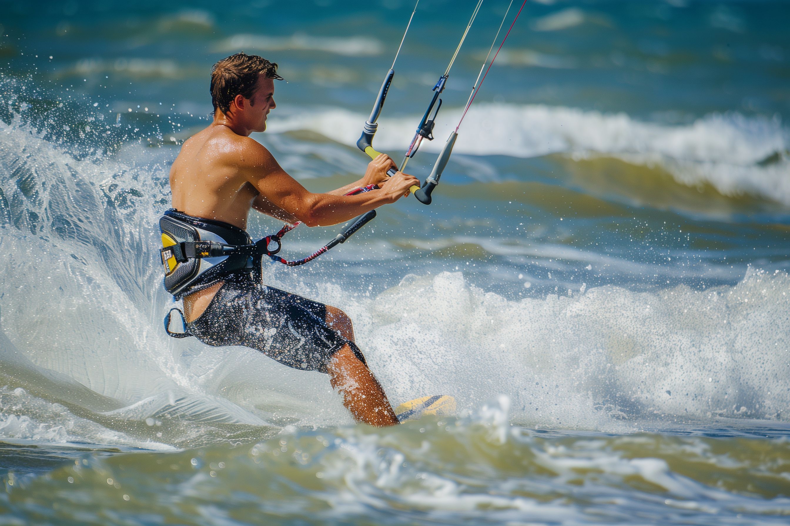 Das Bild zeigt einen Mann, der Kitesurft - eine faszinierende Wassersportart, bei der der Fahrer von einer großen Drachen-Kite angetrieben wird und über die Wellen gleitet. Im Hintergrund ist ein klarer, blauer Himmel mit Wolken zu sehen, während im Vordergrund die Meereswellen spritzen und den Surfer umgeben. Die Dynamik und Bewegung des Geschehens, die kraftvolle Anmutung des Wassers und die unbekümmerte Haltung des Surfers machen dieses Foto zu einem aufregenden und stimmungsvollen Motiv. Als kostenloses Stockfoto in hoher Auflösung und unter Creative-Commons-Lizenz eignet es sich hervorragend für die Verwendung in Blogs, Newslettern, Social-Media-Kanälen oder Werbekampagnen, die Wassersport, Erholung und ein aktives, gesundes Lebensgefühl vermitteln möchten.