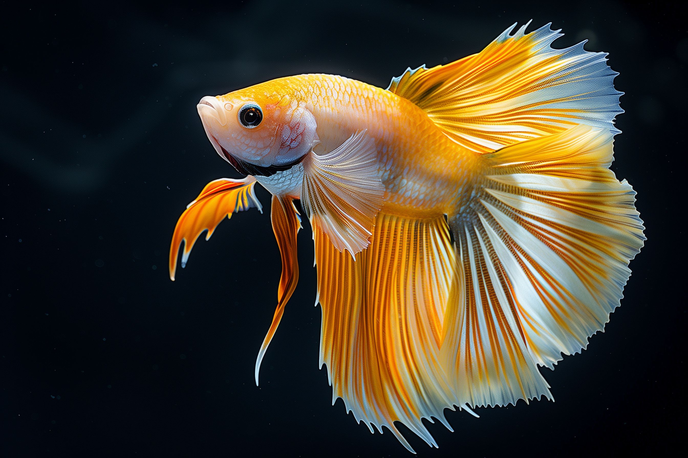 Dieses beeindruckende Foto zeigt einen majestätischen Kampffisch, der in leuchtenden Orange- und Gelbtönen strahlt. Das Bild konzentriert sich ganz auf den Fisch, der vor einem dunklen Hintergrund platziert ist, um die Farbenpracht besonders hervorzuheben. Die feinen Flossen und detaillierten Schuppen verleihen dem Fisch eine fast schwebende Eleganz. Dieses Foto eignet sich hervorragend für den Einsatz in Blogs, Newslettern, auf Social-Media-Kanälen oder in Werbematerialien, um eine natürliche, lebendige und faszinierende Stimmung zu schaffen. Als hochauflösendes, kostenloses Stockfoto unter Creative-Commons-Lizenz ist es perfekt für vielfältige visuelle Anwendungen geeignet.