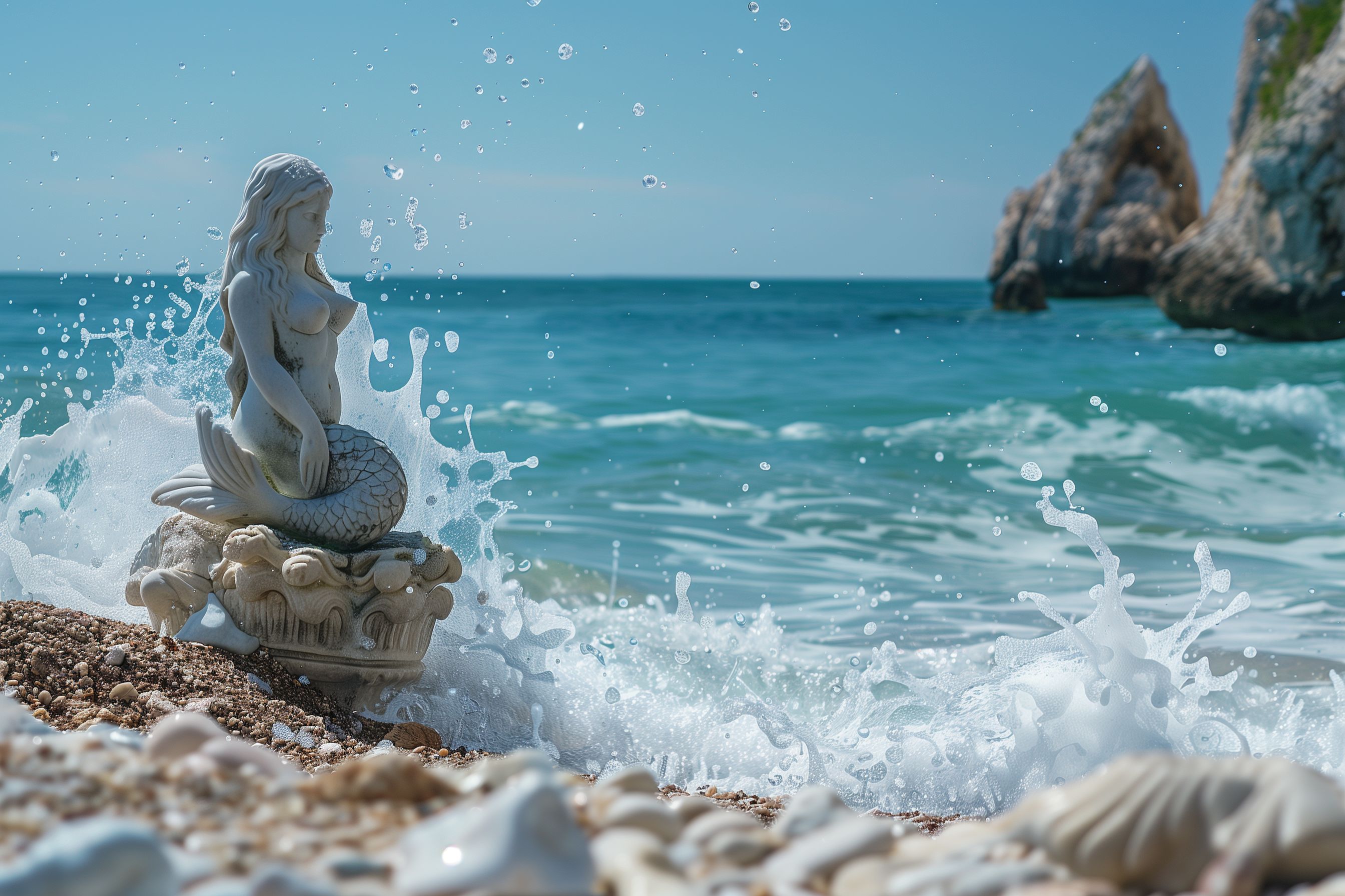 Dieses faszinierende Bild zeigt eine detaillierte Meerjungfrauenfigur, die inmitten von spritzenden Wellen und einem malerischen Hintergrund aus türkisfarbenem Meer und felsigen Klippen platziert ist. Die Statue ist aus hellem Material gefertigt und scheint fast schwebend auf den Wellen zu thronen. Die Komposition und die lebendigen Farben erzeugen eine mystische, märchenhafte Stimmung, die den Betrachter in eine Welt der Fantasie und Imagination entführt. Dieses hochauflösende Stockfoto ist ideal für den Einsatz in Blogs, Websites, Werbekampagnen oder Social-Media-Beiträgen, die eine maritime, natürliche oder mythologische Atmosphäre vermitteln möchten. Es steht unter einer Creative-Commons-Lizenz zur kostenlosen Verwendung zur Verfügung.