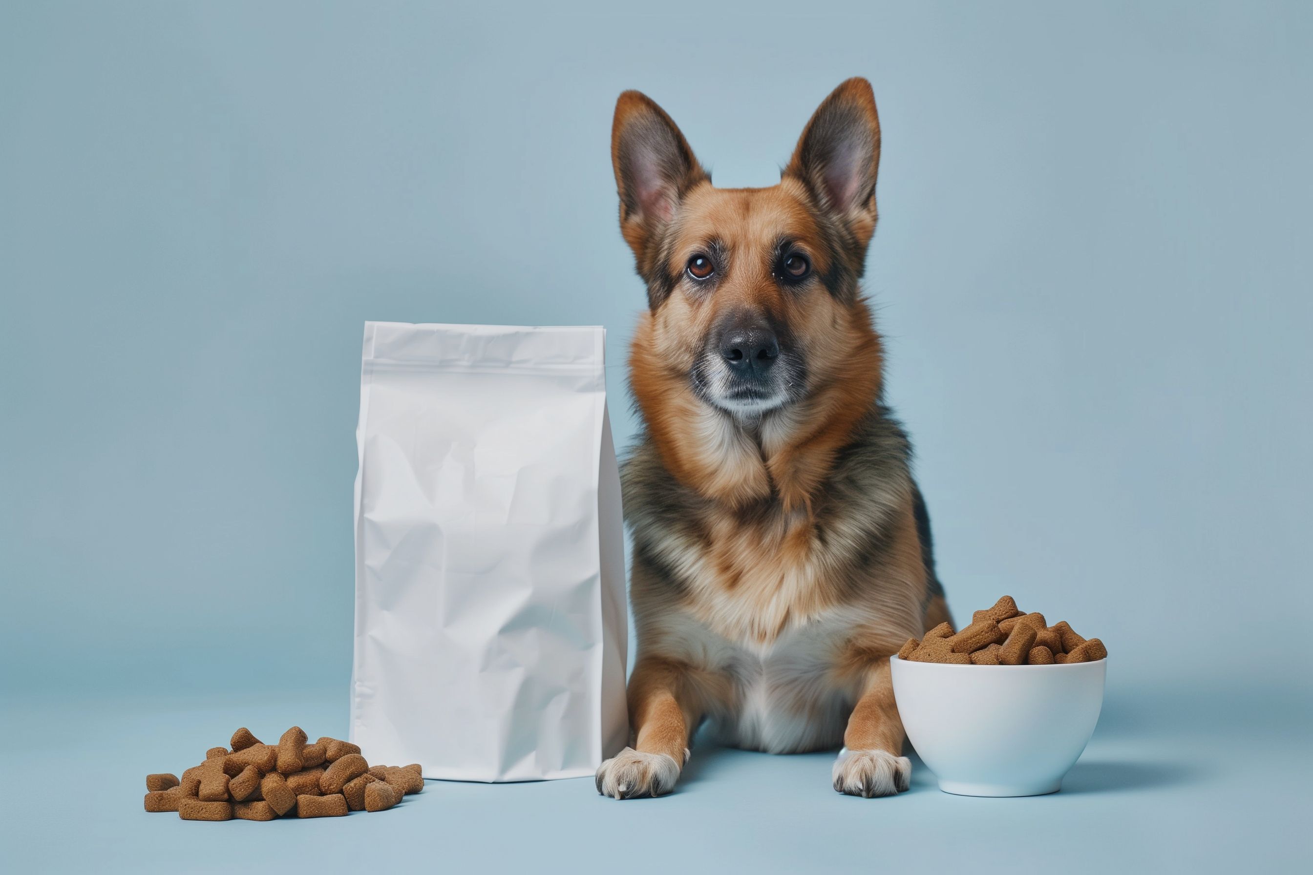 Das Bild zeigt einen braunen deutschen Schäferhund, der vor einem blauen Hintergrund sitzt. Neben ihm stehen ein Hundenäpfchen mit Leckerchen und eine weiße Verpackungstüte. Der Hund blickt direkt in die Kamera und hat einen freundlichen, aufmerksamen Ausdruck. Das Foto ist gut ausgeleuchtet und konzentriert sich klar auf den Hund als Hauptmotiv. Es eignet sich hervorragend als kostenloses Stockfoto für Blogs, Newsletter, Social-Media-Beiträge oder Werbung rund um das Thema Haustiere, Tierfutter und Heimtierbedarf. Die hochwertige Auflösung und Creative-Commons-Lizenz machen das Bild flexibel einsetzbar.