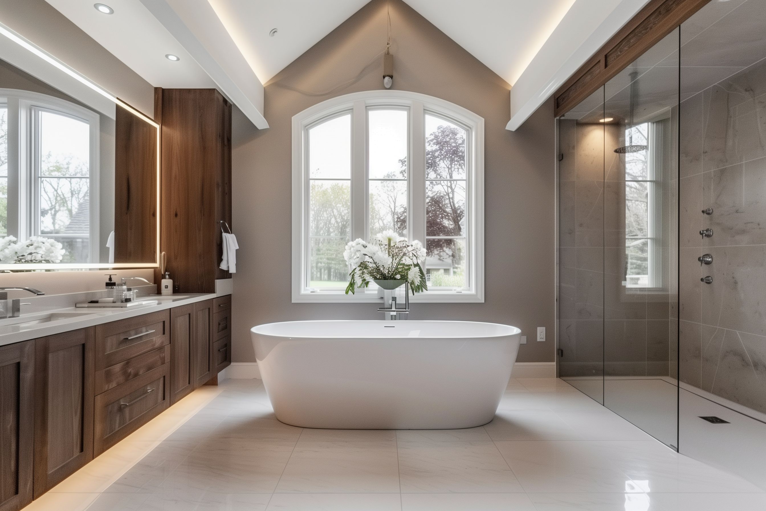 Dieses elegante Badezimmer bietet eine harmonische Mischung aus modernem Design und natürlicher Schönheit. Der Raum ist geprägt von einer warmen Farbpalette, großzügigen Holzmöbeln und einer freistehenden Badewanne, die den Fokus auf sich zieht. Die bodentiefen Bogenfenster sorgen für eine natürliche Beleuchtung und einen Blick ins Freie, was eine entspannende Atmosphäre schafft. Das hochwertige Interieur und die sorgfältige Ausstattung machen dieses Badezimmer zu einem perfekten Ort zum Entspannen und Wohlfühlen. Dieses Stockfoto in hoher Auflösung ist ideal für verschiedenste Anwendungen wie Blogs, Social-Media-Beiträge oder Werbematerial und steht unter einer Creative-Commons-Lizenz zur kostenlosen Nutzung bereit.