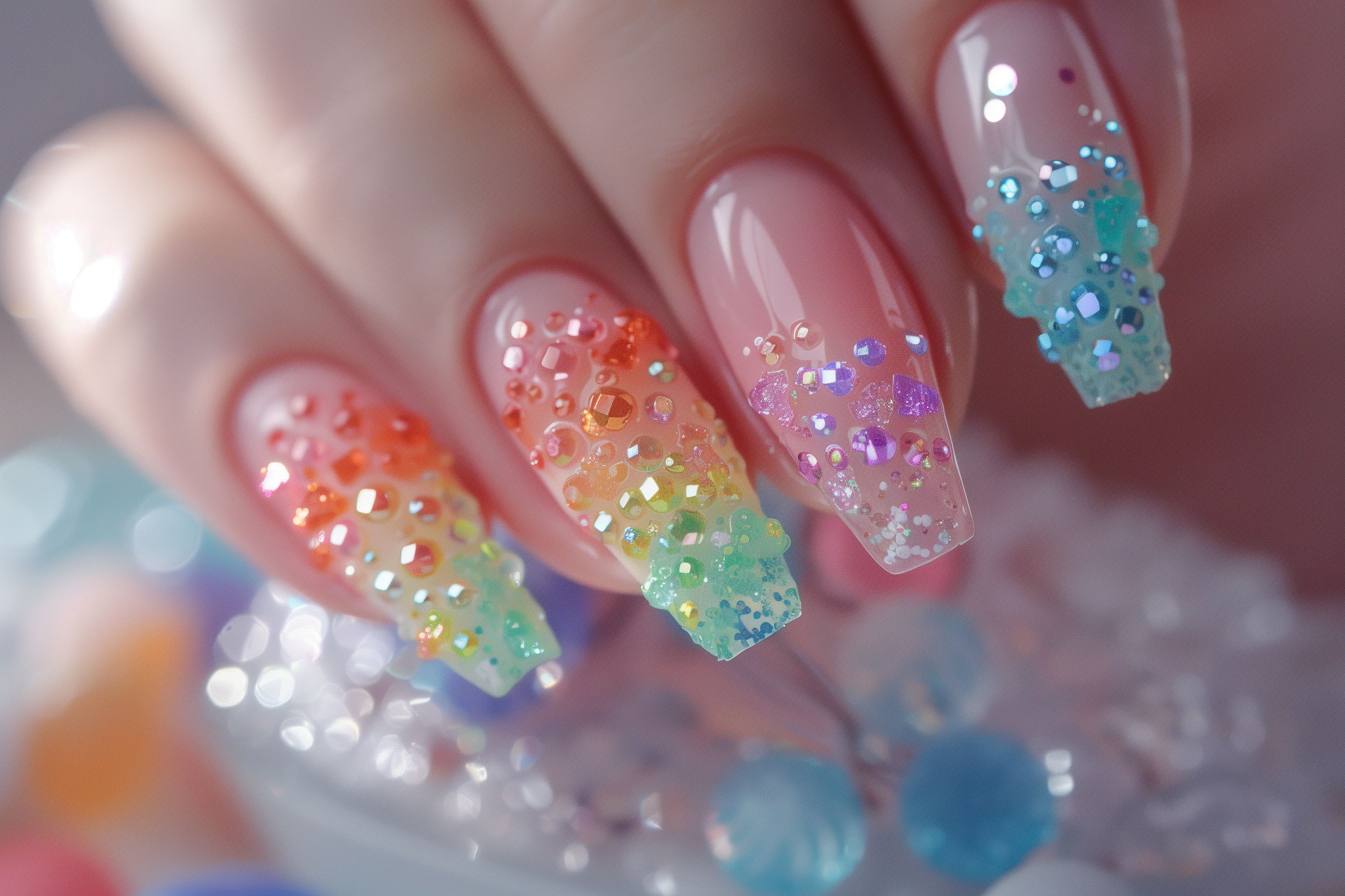 Das Bild zeigt detailreiche, bunte Fingernägel mit einem Regenbogeneffekt und funkelnden Verzierungen. Die langen, spitzen Nägel sind mit verschiedenfarbigen Glitzer- und Paillettenpartikeln dekoriert, die ein glänzendes und farbintensives Gesamtbild ergeben. Die Gestaltung wirkt sehr kreativ, hochwertig und glamourös. Dieses Foto eignet sich hervorragend als kostenloses Stockfoto für Beiträge zu den Themen Kosmetik, Beauty, Maniküre oder Nail Art in hoher Auflösung und unter einer Creative Commons-Lizenz.