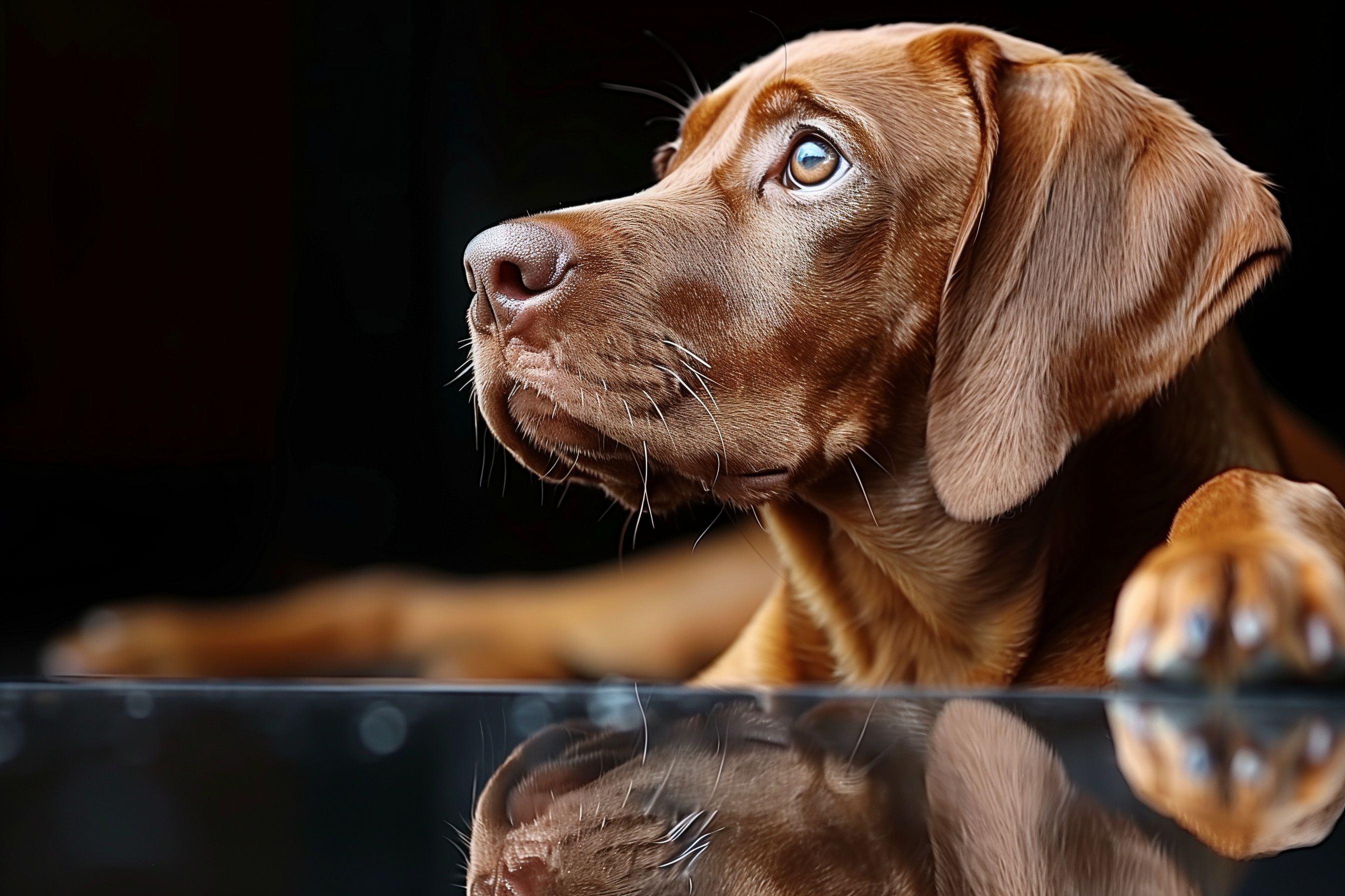 Diese Nahaufnahme zeigt den Kopf eines braunen Hundes vor schwarzem Hintergrund. Der Hund blickt konzentriert und intensiv in die Kamera, sein Gesichtsausdruck ist fokussiert. Seine Augen leuchten blau und verleihen dem Bild eine besondere Tiefe. Die Reflexion des Hundes in einer glatten Oberfläche ergänzt die Komposition und verstärkt den nachdenklichen Ausdruck. Dieses hochauflösende Stockfoto eignet sich hervorragend für den Einsatz in Blogs, Newslettern, Social-Media-Kanälen oder als Werbemotiv. Es ist unter einer Creative-Commons-Lizenz frei nutzbar.