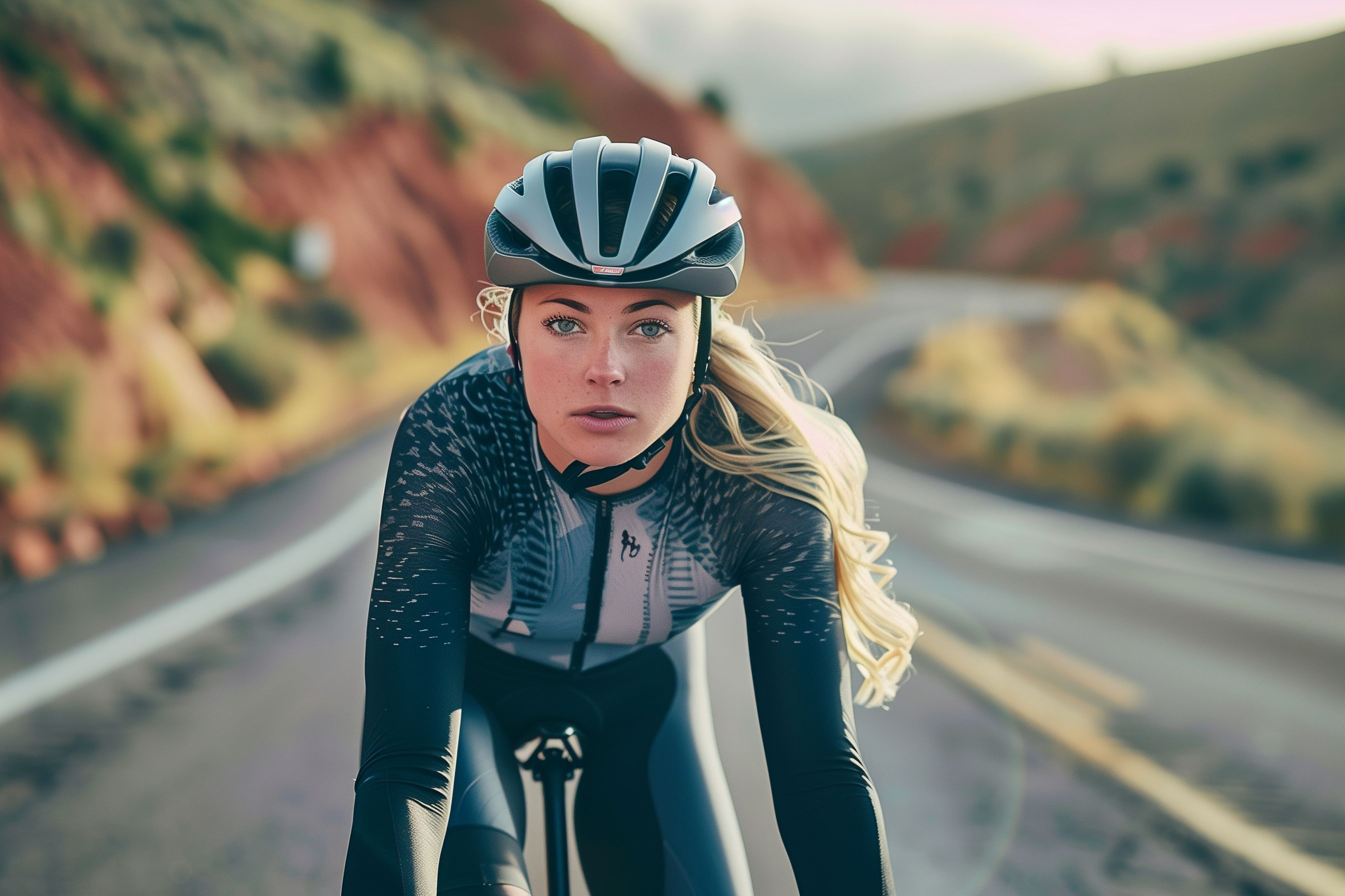 Das Foto zeigt eine entschlossen blickende Rennradfahrerin, die sich auf einer kurvenreichen Bergstraße befindet. Die Sportlerin trägt eine schwarze Radausrüstung mit grau-weißen Akzenten und einen Fahrradhelm. Ihre Körperhaltung und der konzentrierte Gesichtsausdruck vermitteln Entschlossenheit und Fokus. Die malerische Berglandschaft im Hintergrund verleiht der Szene einen stimmungsvollen Rahmen. Dieses hochauflösende Stockfoto eignet sich hervorragend für Verwendungen in Blogs, Newslettern, Social-Media-Kanälen oder Werbekampagnen rund um Outdoor-Sport, Gesundheit und Fitness. Es steht unter der Creative-Commons-Lizenz zur Verfügung.