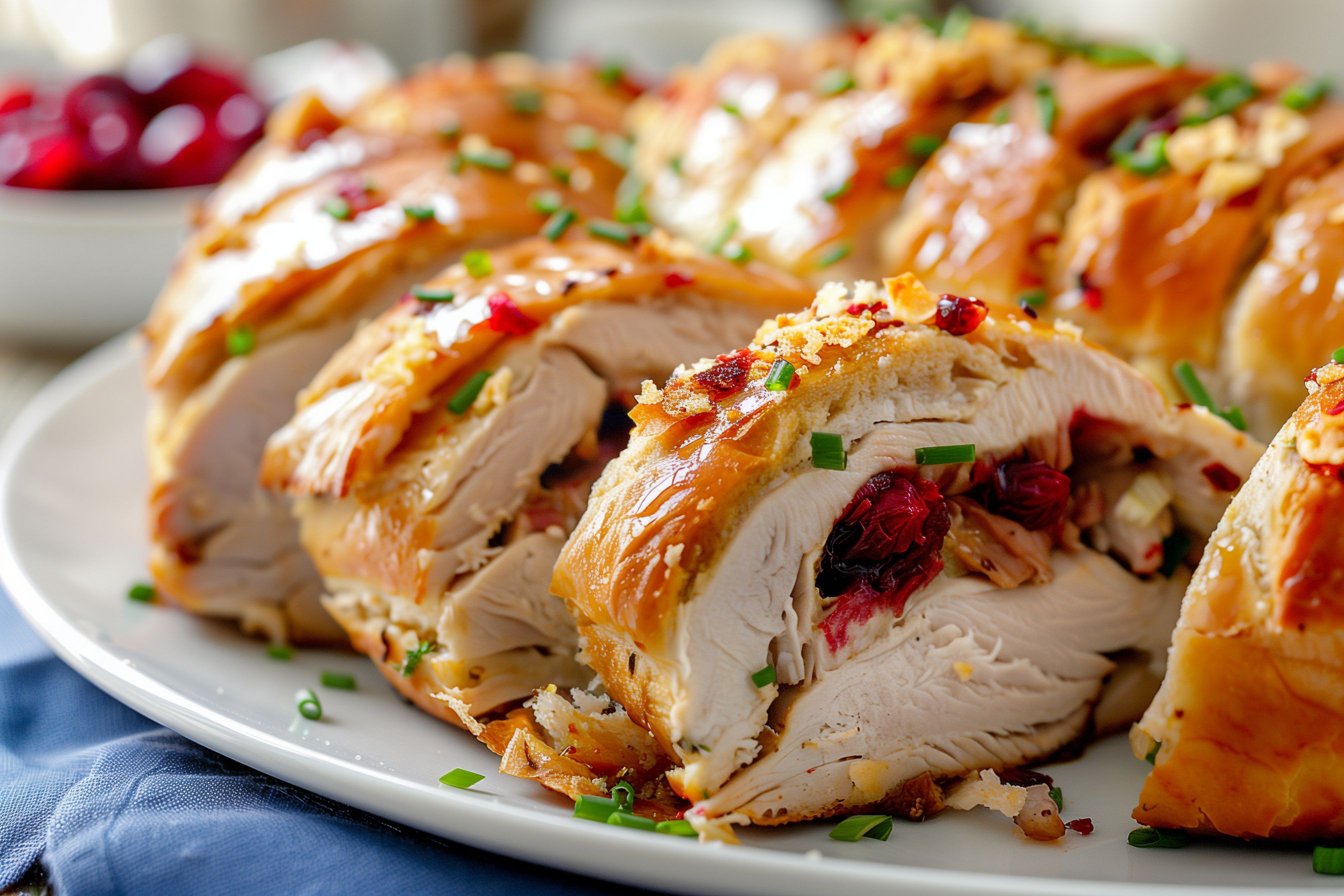 Dieses Foto zeigt eine Nahaufnahme einer gefüllten Putenbrust, die mit Preiselbeeren und Gewürzen zubereitet wurde. Das Fleisch ist goldbraun gebraten und saftig, die Preiselbeeren verleihen dem Gericht einen leckeren, süß-säuerlichen Geschmack. Das Foto ist im rustikalen Stil aufgenommen, mit einer natürlichen Farbgebung und scharfer Fokussierung. Dieses Bild eignet sich hervorragend für kulinarische Blogs, Kochbücher, Werbematerialien für Lebensmittel oder Rezeptsammlungen rund um das Thema Herbstküche und Festtagsessen. Als hochwertiges Stockfoto in hoher Auflösung und unter Creative-Commons-Lizenz ist es für viele Verwendungszwecke frei nutzbar.
