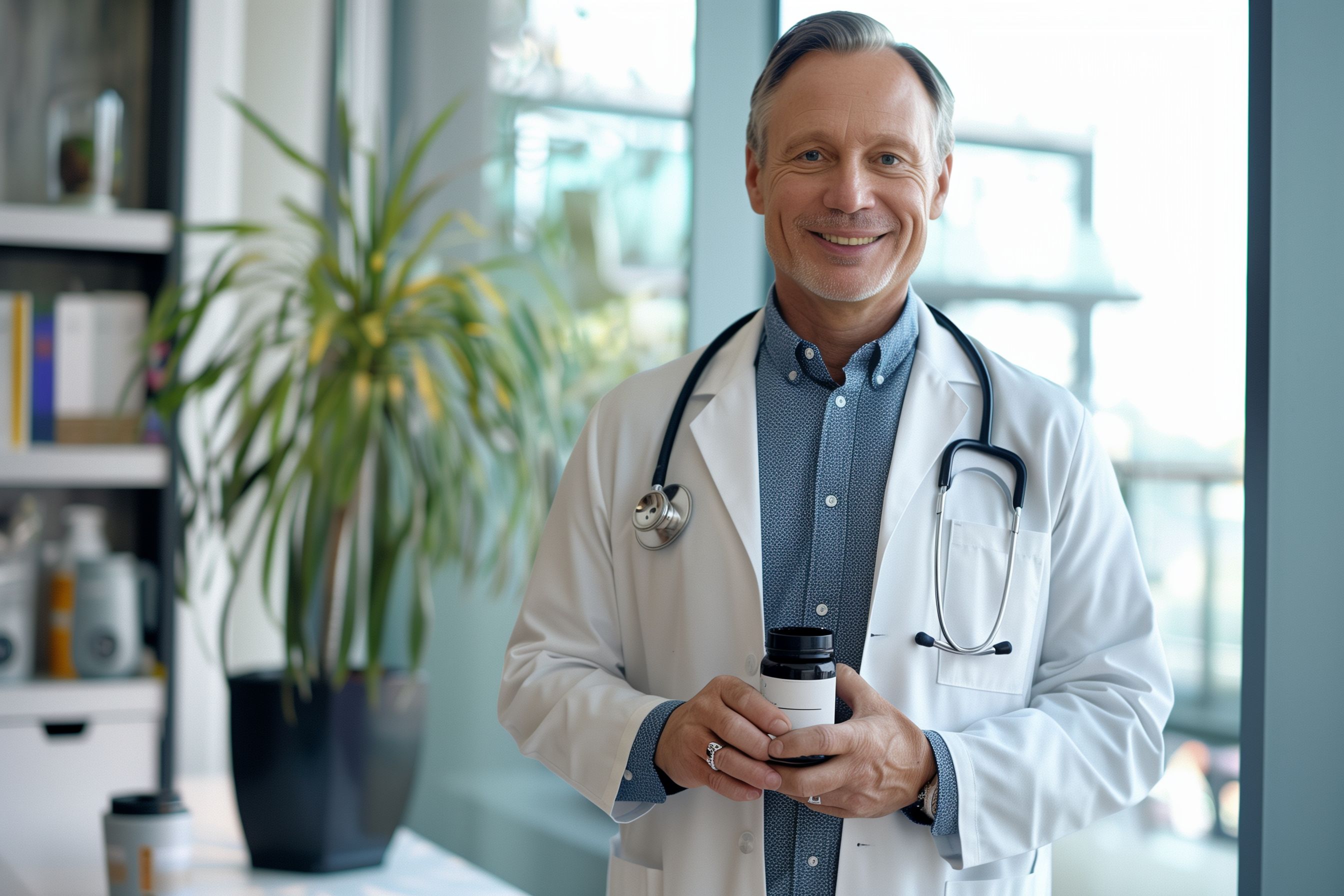 Das Foto zeigt einen freundlichen und zufriedenen Arzt, der in seiner Praxis steht und eine Dose mit Nahrungsergänzungsmitteln in der Hand hält. Er lächelt und strahlt Vertrauen und Kompetenz aus. Der Hintergrund der Szene ist von einem großen Fenster geprägt, durch das Tageslicht einfällt und eine offene, helle Atmosphäre schafft. Ein Pflanzendekoration auf einem Regal im Hintergrund rundet das Bild ab und verleiht dem Raum eine angenehme, natürliche Note.