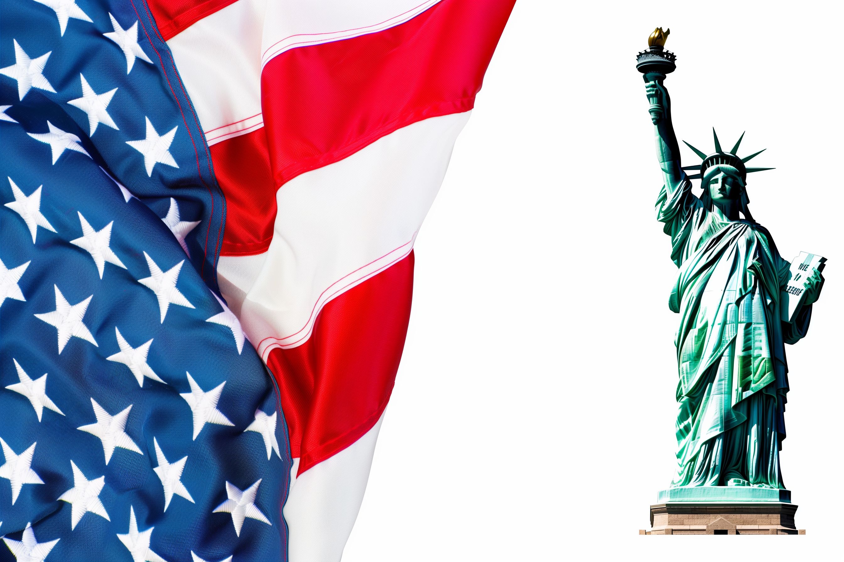Dieses Stockfoto zeigt die Freiheitsstatue, eines der bekanntesten Wahrzeichen der Vereinigten Staaten von Amerika, vor einem weißen Hintergrund. Im Vordergrund ist die amerikanische Flagge mit ihren charakteristischen Sternen und Streifen zu sehen. Die Komposition unterstreicht die Symbolik von Freiheit und Patriotismus, die mit dem 4. Juli, dem US-amerikanischen Unabhängigkeitstag, verbunden sind.