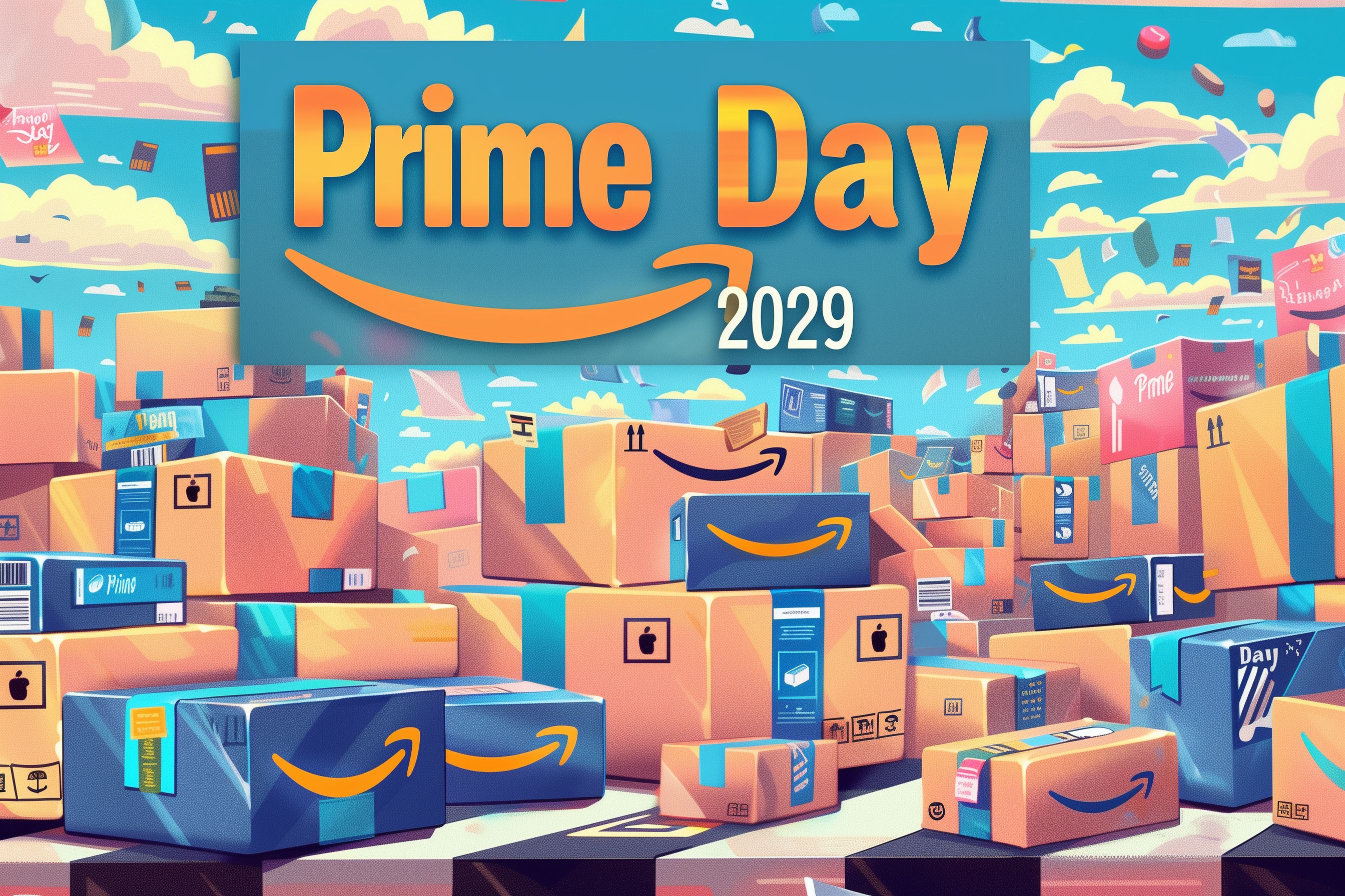 Diese farbenfrohe Illustration zeigt eine bunte Warenwelt zum Amazon Prime Day 2029. Zu sehen ist ein Mehr an Kartons, Packmaterial und Amazon-Logos, das sich in einer fantasievollen Kulisse aus Wolken und Himmel erhebt. Die dynamische Komposition und der cartoon-artige Stil vermitteln Dynamik und Bewegung, als würde die Logistik-Welt zur Hochform auflaufen. Dieses Stockfoto eignet sich hervorragend für Beiträge rund um den Online-Shopping-Höhepunkt, sei es in Blogs, Newslettern oder sozialen Medien. Es ist in hoher Auflösung und unter einer Creative-Commons-Lizenz kostenlos verfügbar.