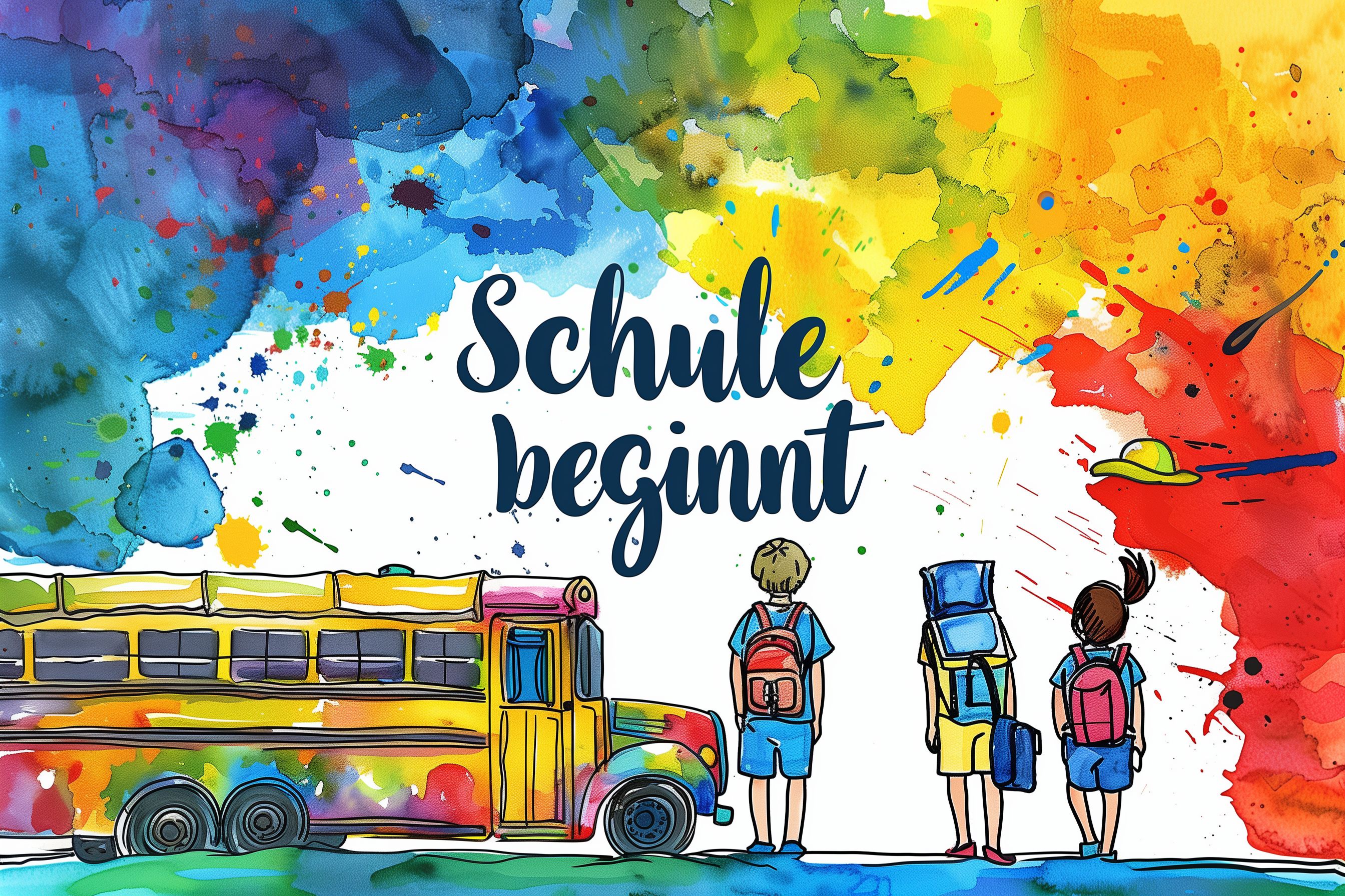 Das Bild zeigt eine bunte und fröhliche Szene des Schulbeginns. Im Vordergrund sind drei Kinder mit Rucksäcken zu sehen, die vor einem bunten Schulbus stehen. Der Hintergrund ist eine Explosion von Farben in Form von abstrakten Wasserfarbenspritzern in verschiedenen Blau-, Grün-, Gelb- und Rottönen. Das Bild vermittelt ein Gefühl von Aufregung, Kreativität und Neuanfang, das mit dem Beginn der Schule einhergeht. Es eignet sich hervorragend als kostenloses Stockfoto für Blogs, Newsletter, Social-Media-Beiträge und Werbematerial rund um das Thema Bildung, Schule und Einschulung. Die hochauflösende Datei steht unter der Creative-Commons-Lizenz zur Verfügung.