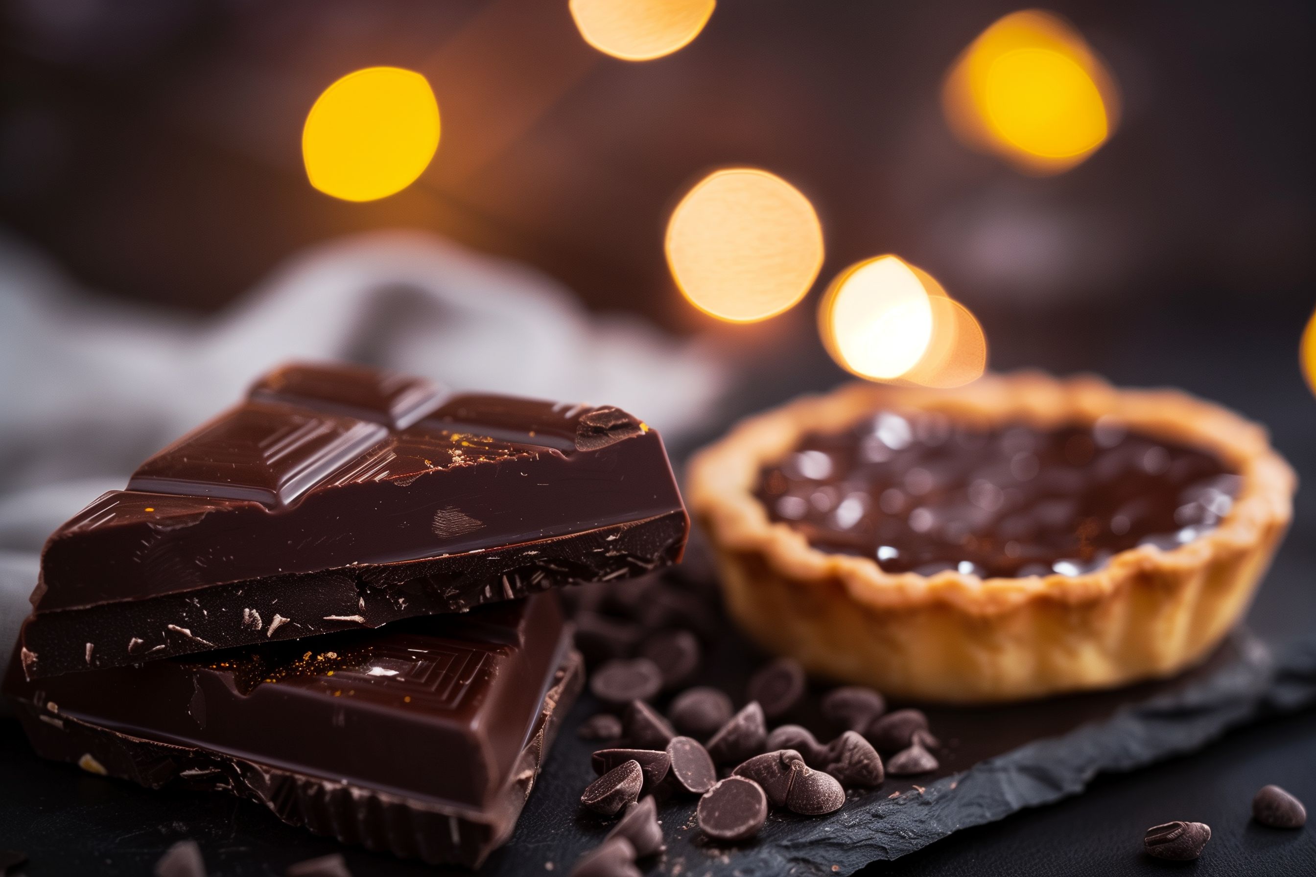 Das Bild zeigt eine Nahaufnahme von dunkler Schokolade und einer Schokoladentarte vor einem Hintergrund mit verschwommenen, goldenen Lichtpunkten. Die Schokoladenstücke und die Tarte sind detailliert zu erkennen, wodurch die Textur und Farbe der Zutaten deutlich hervortritt. Die Beleuchtung erzeugt eine warme, festliche Stimmung und verleiht dem Foto eine gemütliche Atmosphäre. Das Bild eignet sich hervorragend für die Verwendung in Blogs, Newslettern, Social-Media-Beiträgen oder Werbematerialien rund um Schokolade, Desserts und winterliche Stimmung. Dieses hochauflösende Stockfoto ist kostenlos und unter einer Creative-Commons-Lizenz verfügbar.